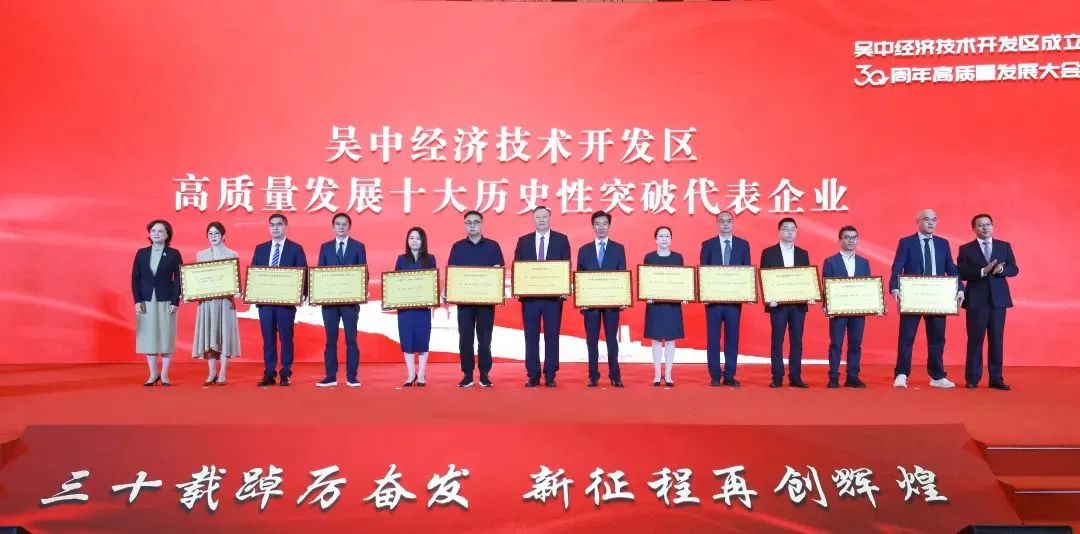 30年來,經開區經濟社會發展取得了令人矚目的成績,數萬家企業在這片熱土上書寫著發展、跨越和趕超的故事,實現了一個又一個“零”的突破,大會評選出十大歷史性突破代表企業,吳中醫藥母公司江蘇吳中醫藥發展股份有限公司獲評“第一家本土上市企業”。